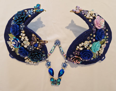 A royal blue glitter base with roses, flowers, pearls, rhinestones, and butterflies to detail (straps attached)