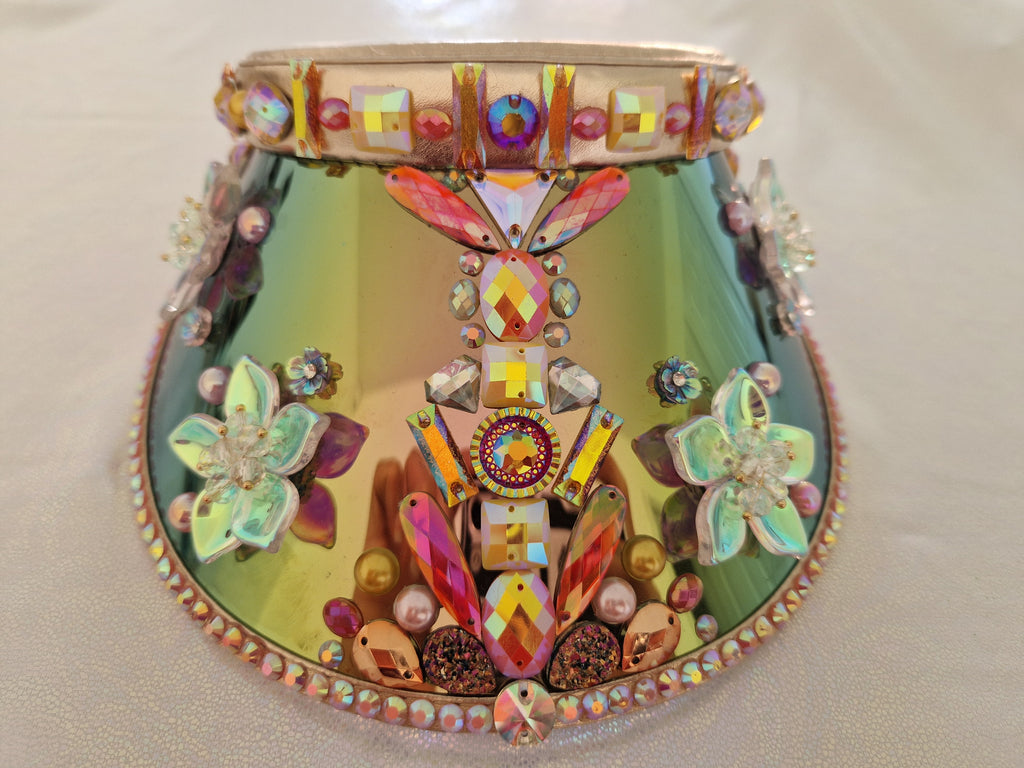 Rose gold reflective visor with multicoloured rhinestones, peals, and flower detail