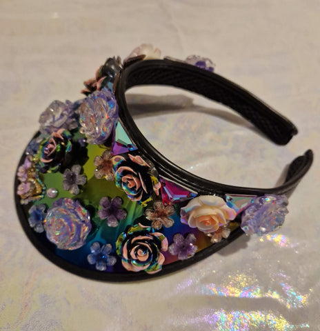 Black iridescent visor with multi-colored roses, flowers, pearls, and rhinestone detail with a butterfly at the center